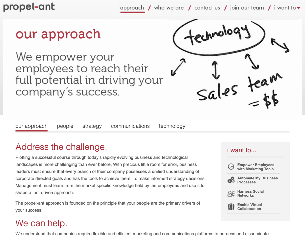 propel-ant is a consulting company specializing in problem solving, marketing, and technology solutions. They wanted a website that better reflected their full range of skills and specialties, with navigation that made it easy for visitors to the site to find what they were looking for.